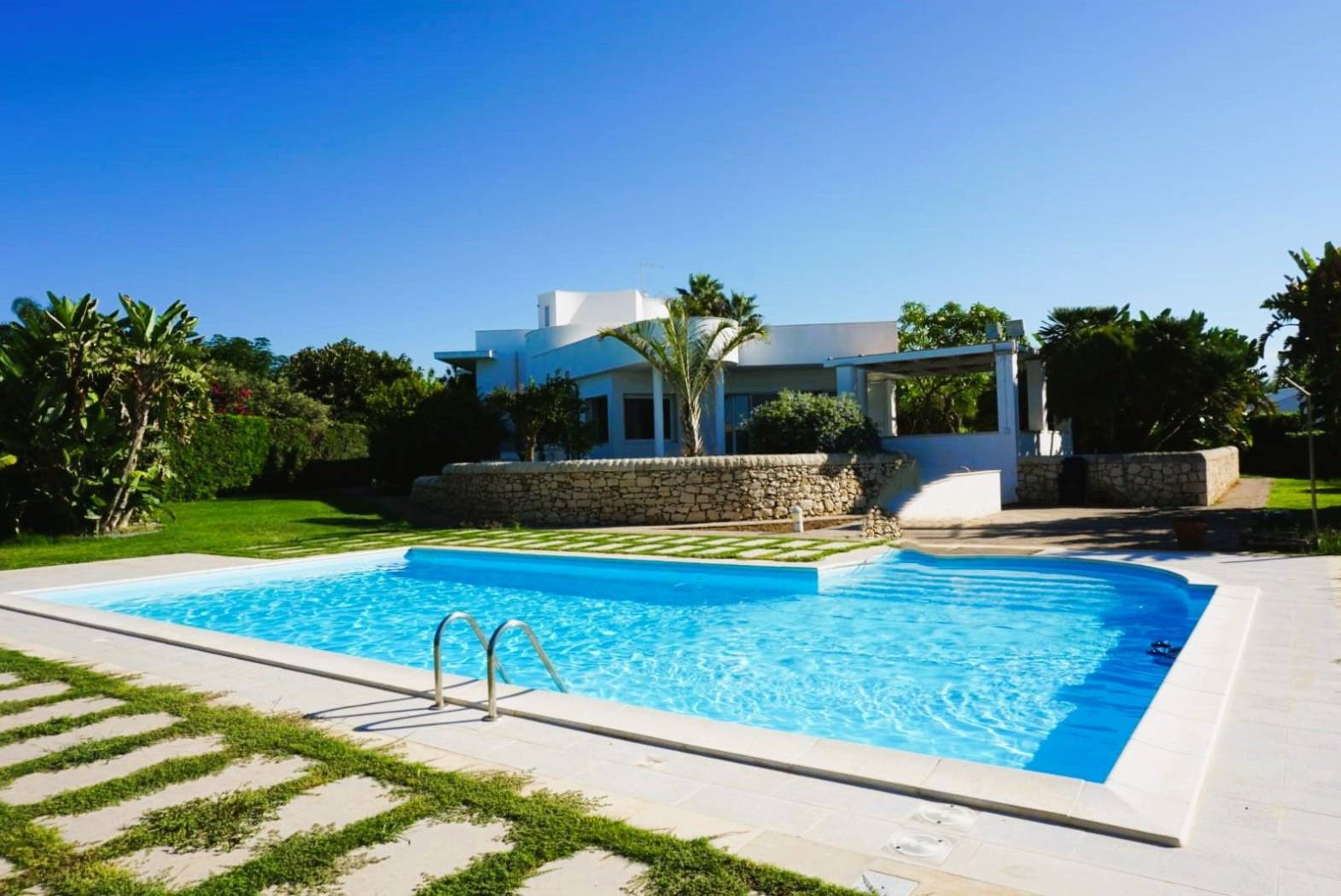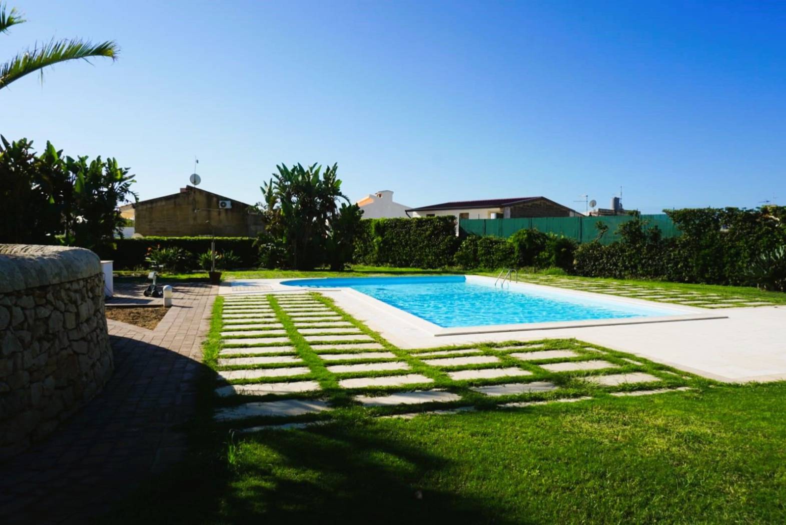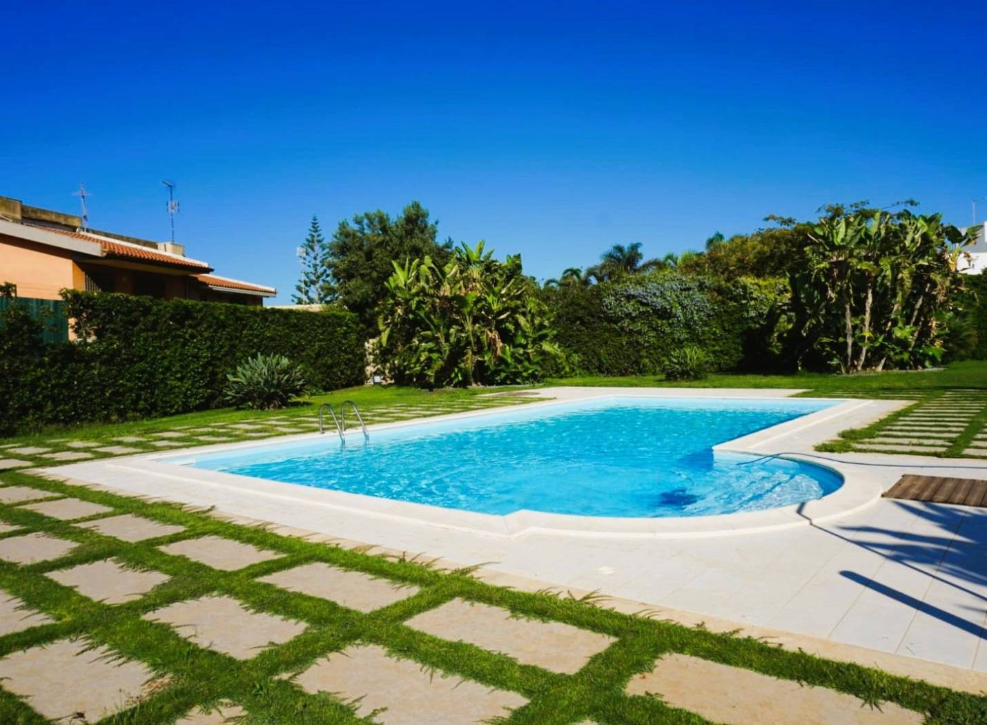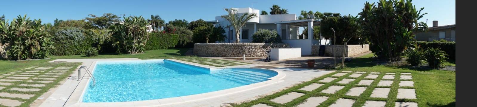 Piscina privata con prato e vegetazione mediterranea