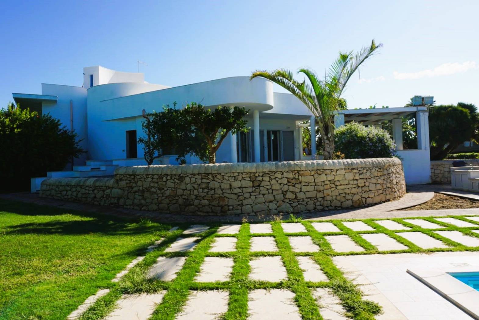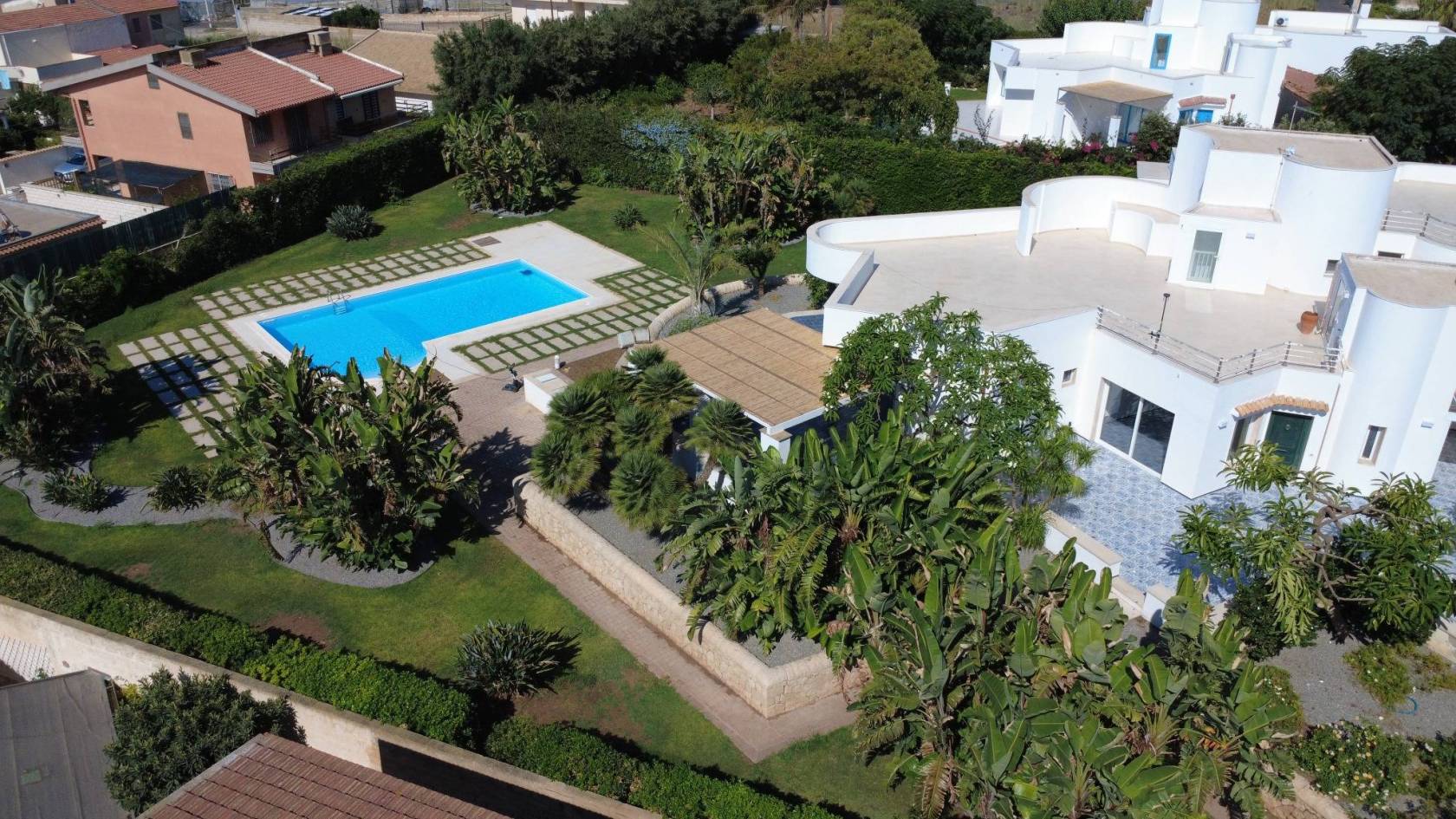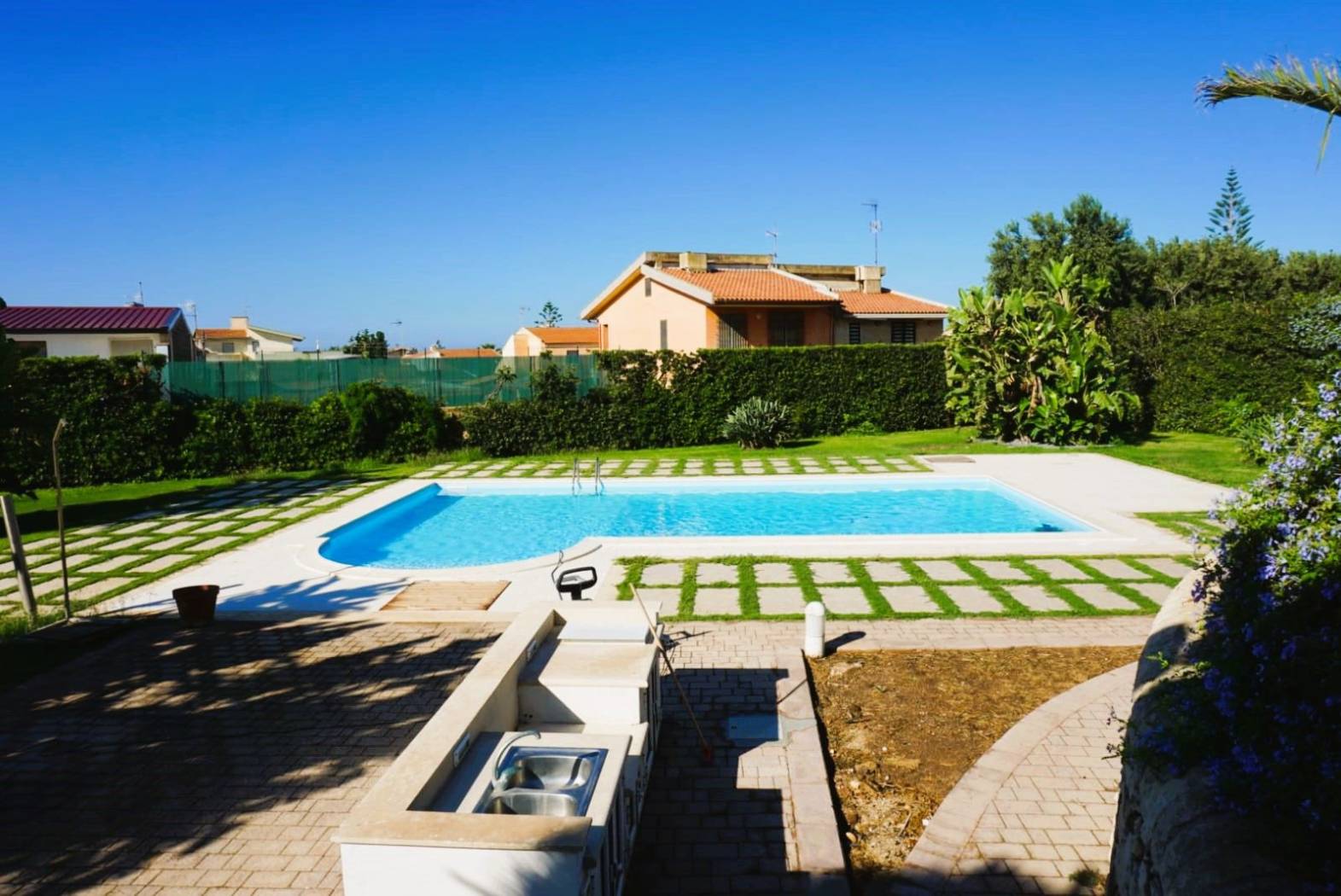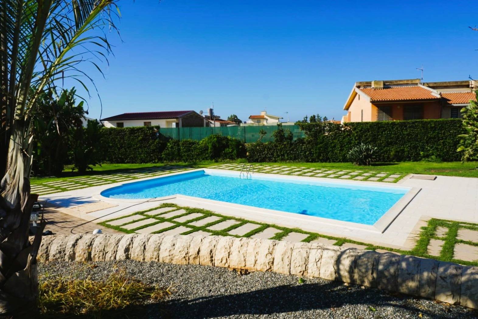 Piscina privata con prato e vegetazione mediterranea