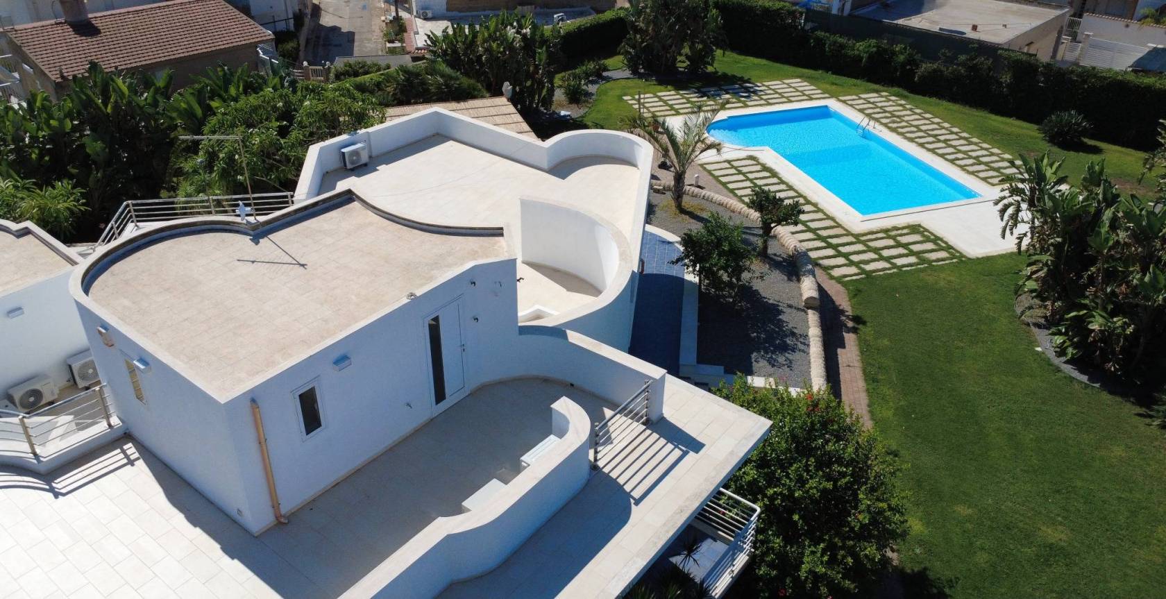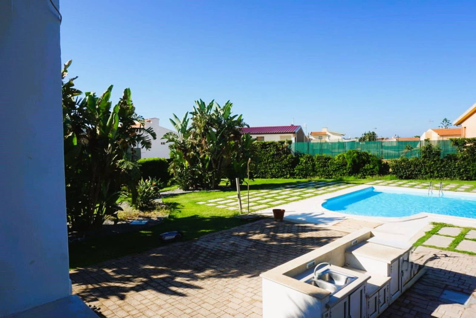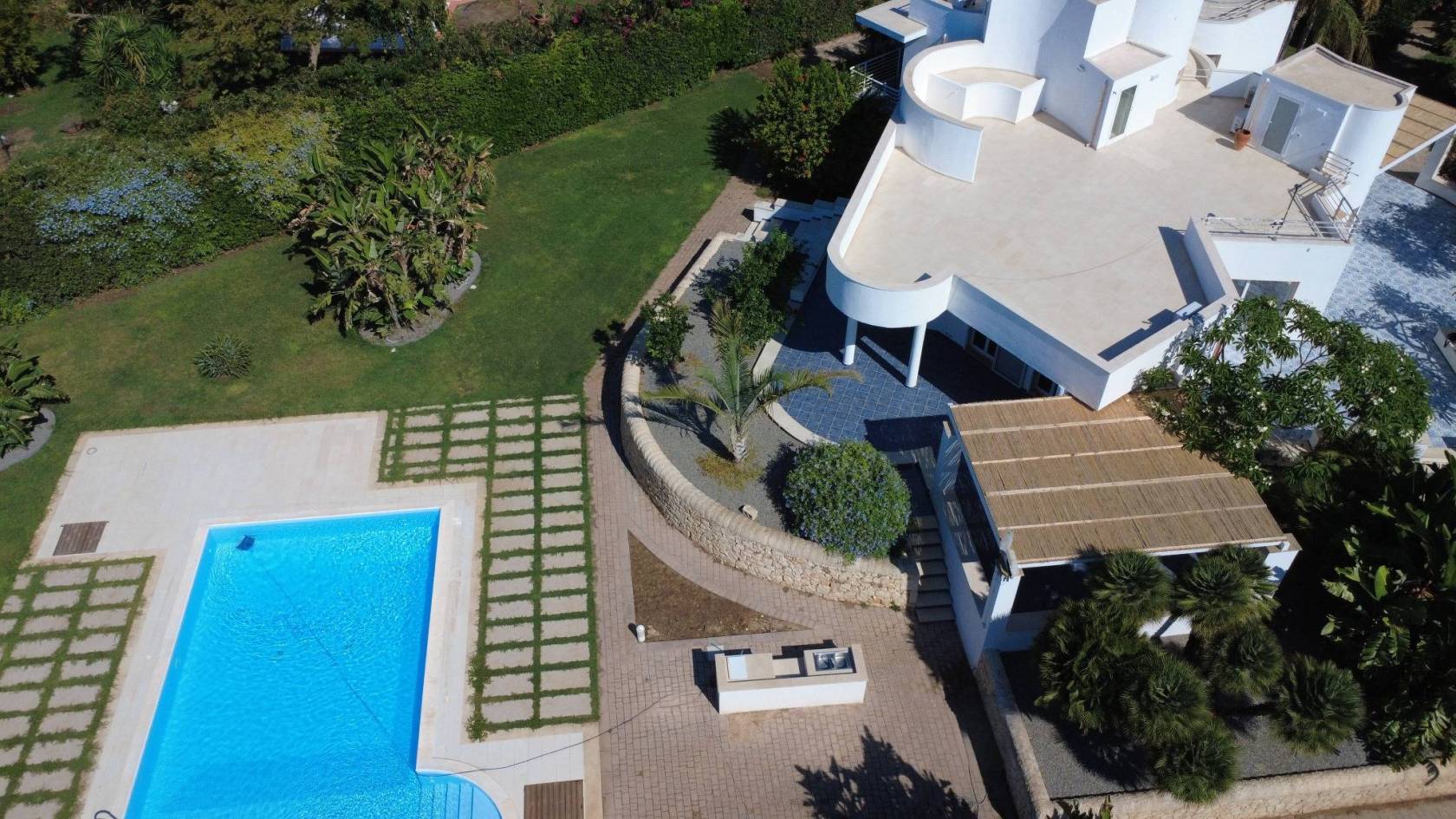 Piscina privata con prato e vegetazione mediterranea