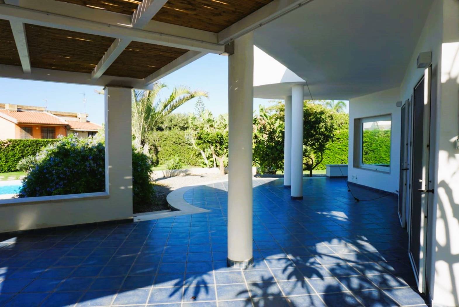 La veranda panoramica di 100 mq si affaccia su giardino e piscina, ideale per pranzi e relax all'aperto.
